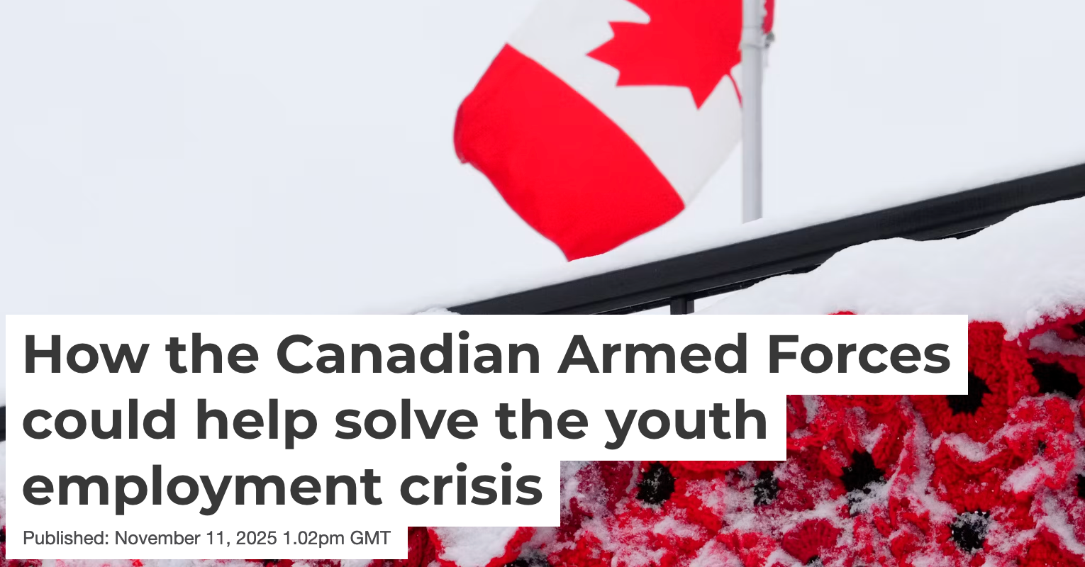 A new op-ed by our Managing Director, Ilona Dougherty, highlights a critical opportunity in Canada’s 2025 budget: leveraging the major reinvestment in the Canadian Armed Forces to confront the worsening youth employment crisis. While young Canadians face the toughest job market in a decade, the CAF continues to struggle with recruitment and retention, creating a moment where youth-serving organizations and the military must work together. With meaningful roles, better support and modernized training, this generational investment could open real pathways for young people to thrive while strengthening Canada’s future.