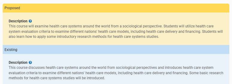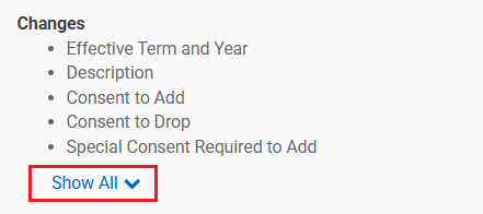 - Changes: For proposals that are changing existing curriculum, a summary of changes occurring within the proposal. This will help guide you to quickly find what is changing. This list is automatically generated by the system.