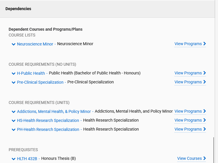 If populated, which is done automatically by the system, the Dependencies section indicates all the other courses and programs/plans where the proposal is linked (e.g., due to requisites or plan requirement lists).