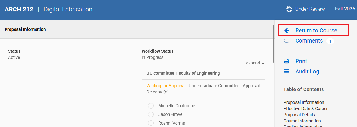 - Course Proposal Details; if applicable, this will provide a summary of what is occurring to courses.