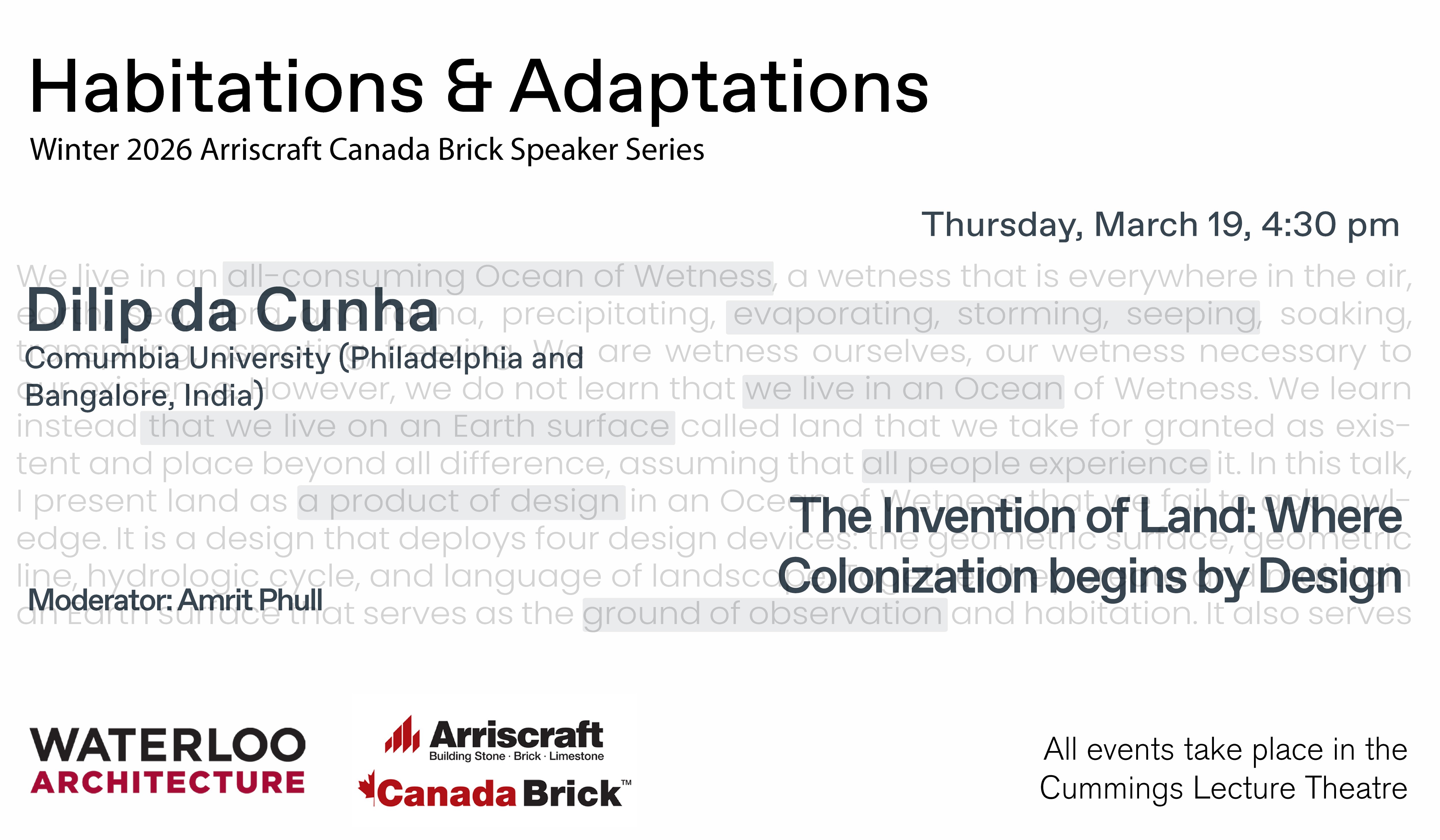 The Arriscraft Canada Brick Speaker Series at the University of Waterloo School of Architecture brings leading voices from architecture and design to share insights, ideas, and innovations shaping the built environment. This lecture series fosters dialogue between professionals, students, and the community, offering a platform for discussions on contemporary architectural practice. All lectures are free and open to the general public
