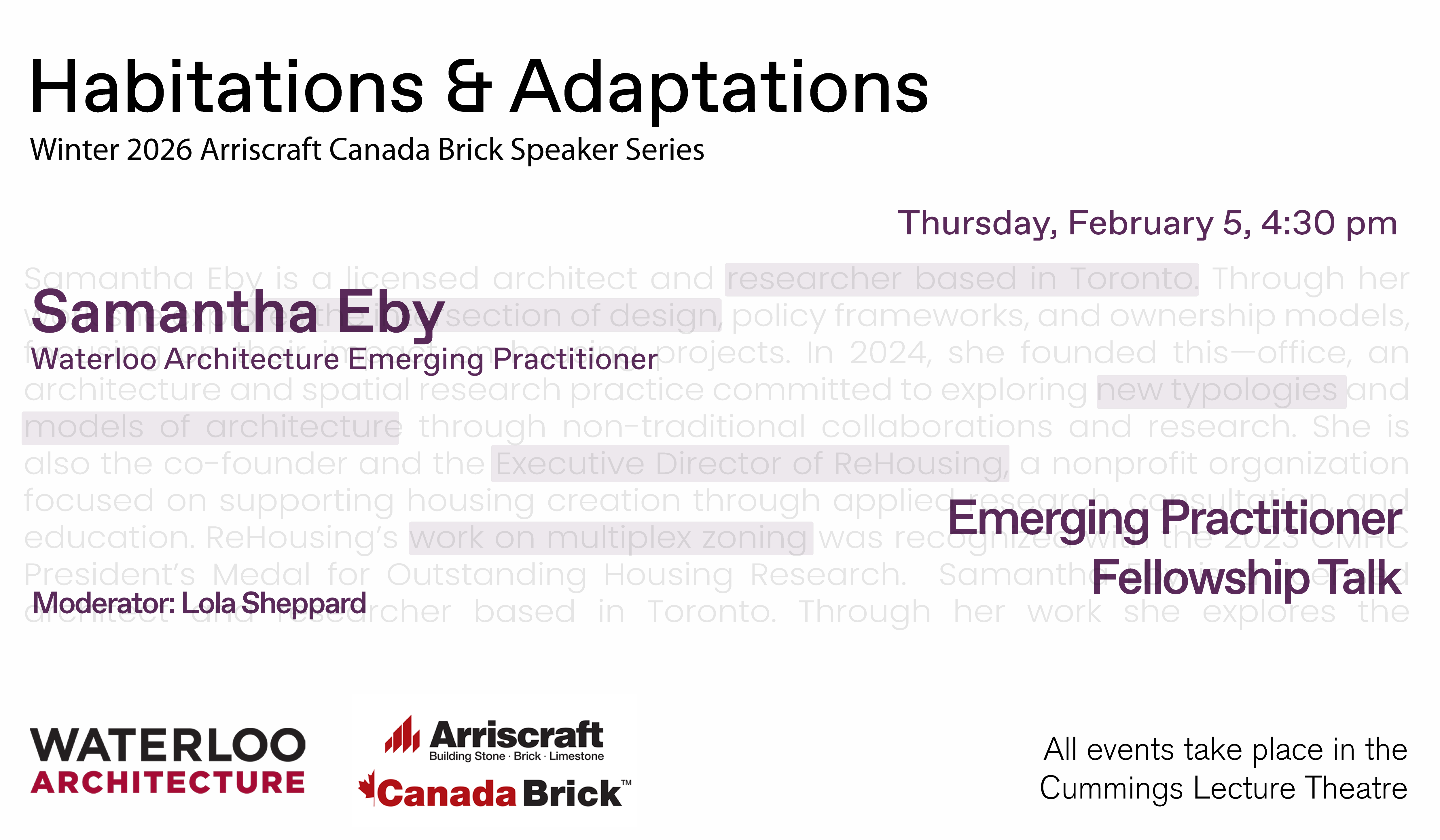 The Arriscraft Canada Brick Speaker Series at the University of Waterloo School of Architecture brings leading voices from architecture and design to share insights, ideas, and innovations shaping the built environment. This lecture series fosters dialogue between professionals, students, and the community, offering a platform for discussions on contemporary architectural practice. All lectures are free and open to the general public