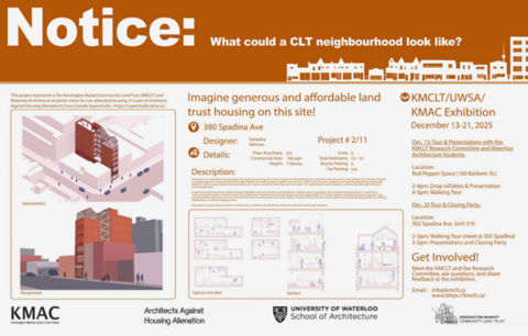 KMCLT has been working with a studio course at the University of Waterloo School of Architecture– “Architectures of relation: Infilling affordable housing in Kensington Market.” Come and see what the students have dreamed up! The exhibition is supported by the Kensington Market Action Committee (KMAC). The project is part of a cross-Canada "Superstudio"–”End Housing Alienation Now!" that unites 14 architecture schools in studio courses that demand affordable and generous housing in response to today's housing emergency.