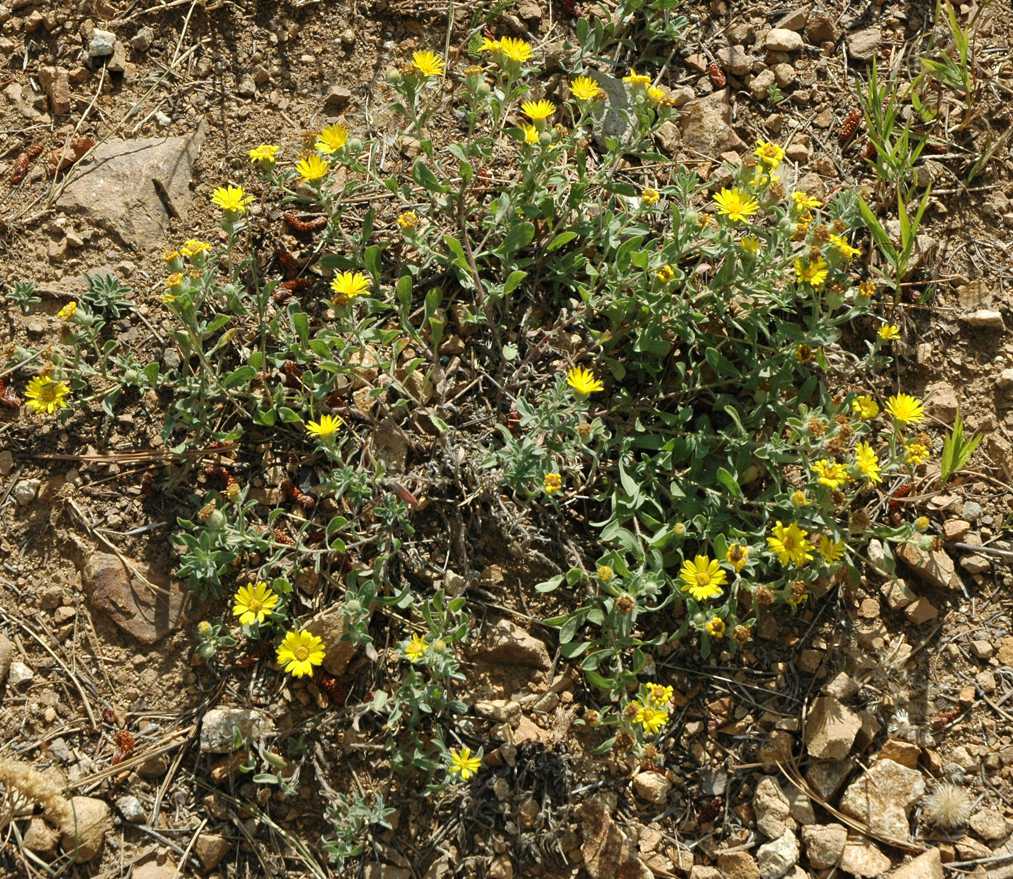 Heterotheca villosa var. foliosa (Nutt.) Harms is one of the hairy-leaved sparsely glandular varieties of the species. Semple (1996) separated the variety from var. villosa by having narrowly to broadly oblong leaves, bracts subtending heads often exceeding the involucres, and stems often with numerous long spreading hairs; and it was separated from var. ballardii by having less showy rays.
