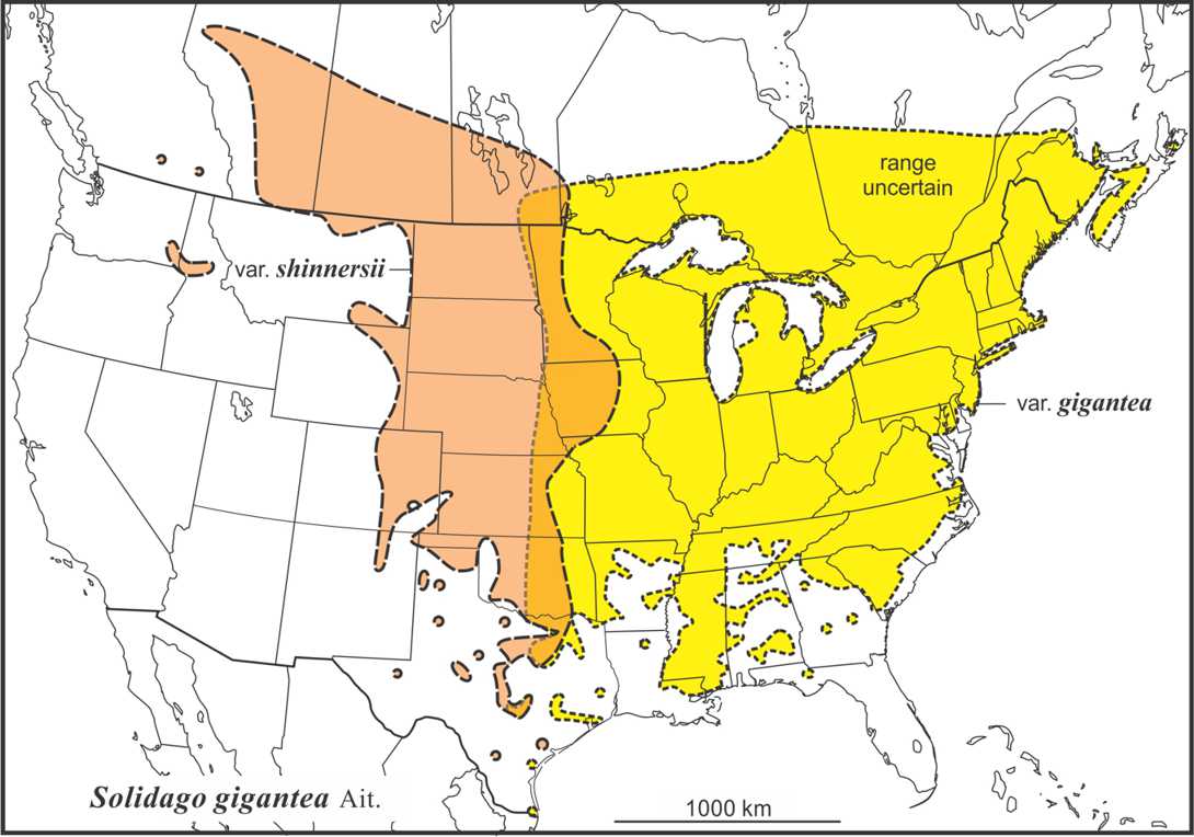 Solidago gigantea Ait. is native to at least seasonally moister soils, flood plains, ditches, depressions, open woods, and thickets of eastern Canada and the U.S. and moist depressions in grasslands and parklands on the Great Plains. It is usually the least hairy species of the S.canadensis complex, and has a more open branched, broadly secund conical inflorescence that is less leafy than S. lepida var. lepida (Semple & Cook 2006 FNA).
