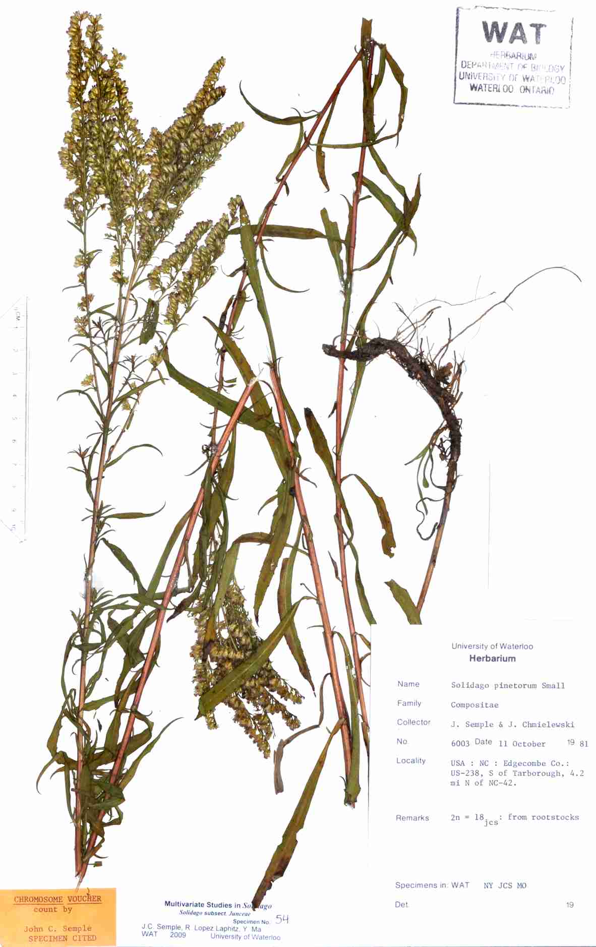 Solidago pinetorum Small is native to sandy soils and rocky sand bars in open places and dry woods in Virginia and the Carolinas. It has fewer ray florets (mostly 3–8) and disc florets (3–9) (Semple & Cook 2006 FNA) than S. juncea. Solidago pinetorum was included in a multivariate study of subsect. Junceae but did not separate strongly from other taxa; sample sizes were relatively small and included S. gattingeri now placed in subsect. Radulae. The species is diploid (2n=18).