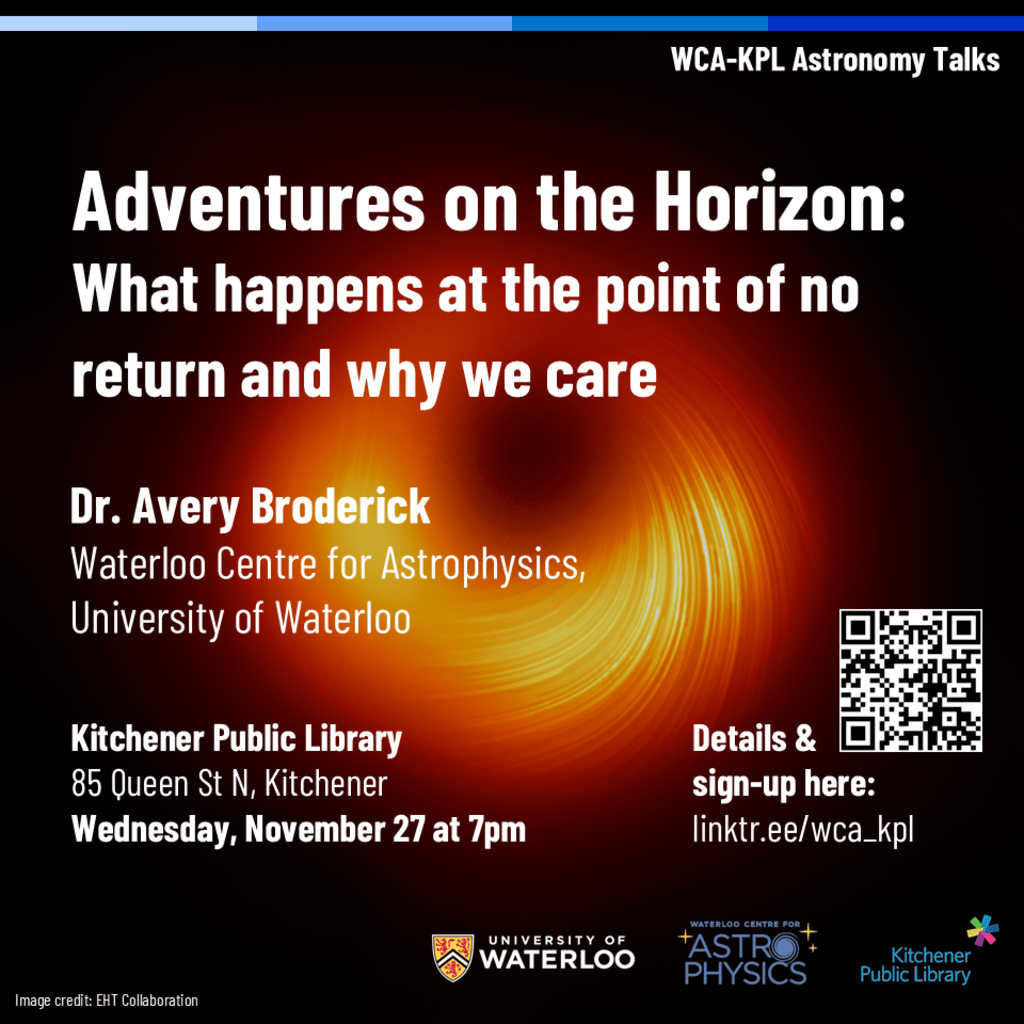 In the past few years, we have seen for the first time an image of the “event horizon” around a supermassive black hole – the mysterious and powerful object lying at the heart of a nearby galaxy. In this month’s KPL astronomy talk, Dr. Avery Broderick will talk about what we can learn about fundamental physics from these images, and how we go from a fuzzy image to sharp conclusions about the nature of gravity.