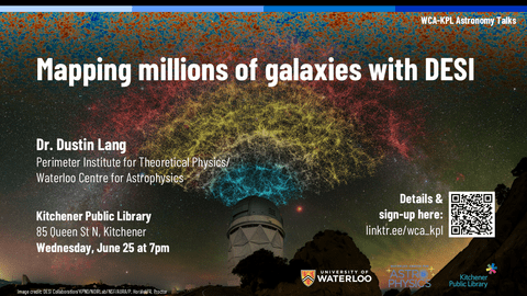 The Dark Energy Spectroscopic Instrument (DESI) is helping scientists to produce the largest and most comprehensive map of galaxies ever seen. This map is then being used by cosmologists to understand the growth of the Universe over cosmic time. In this month’s KPL astronomy talk, Dustin Lang will discuss the technology behind this innovative experiment, and how these advances have allowed cosmologists to make insights that change our view of the Universe.