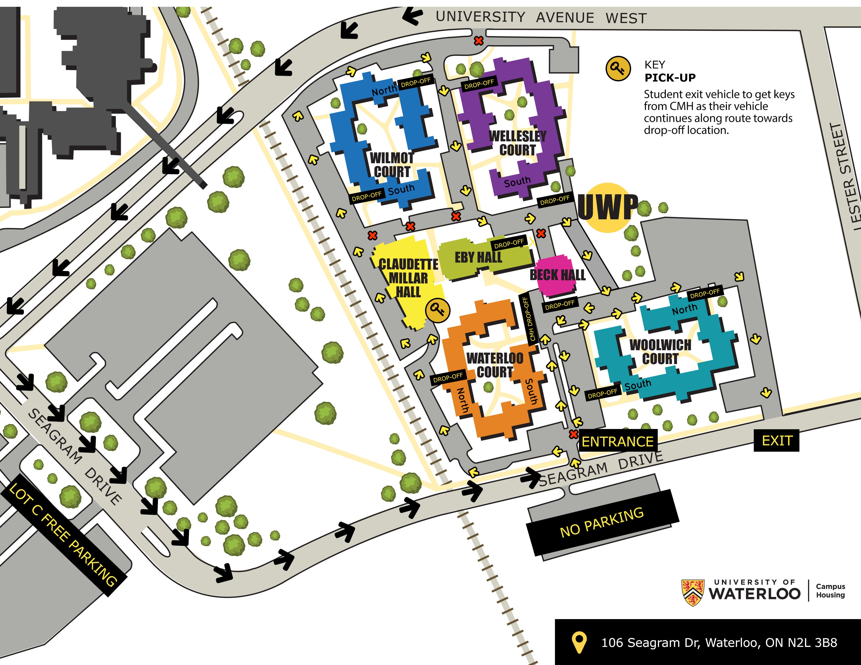 Once you arrive, head to your residence’s key pick-up location (identified on your move-in map) while your vehicle proceeds to the unloading zone. At the front desk, share your UWaterloo student ID number and show your government-issued photo identification (ID) to pick up your room key.