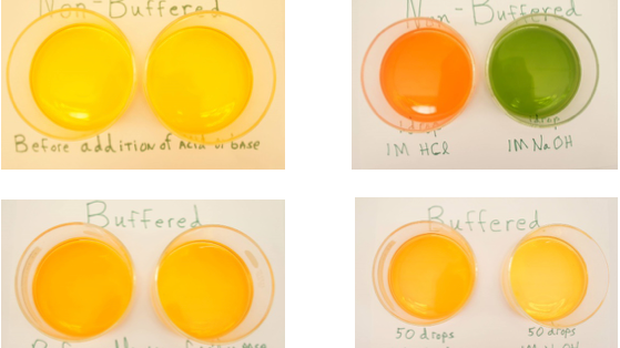 - Repeat steps 3 through 6 described for the non-buffered solution. It should require a great deal more of the 1.0 M HCl and 1.0 M NaOH to produce a color change than needed for the non-buffered mixture.
