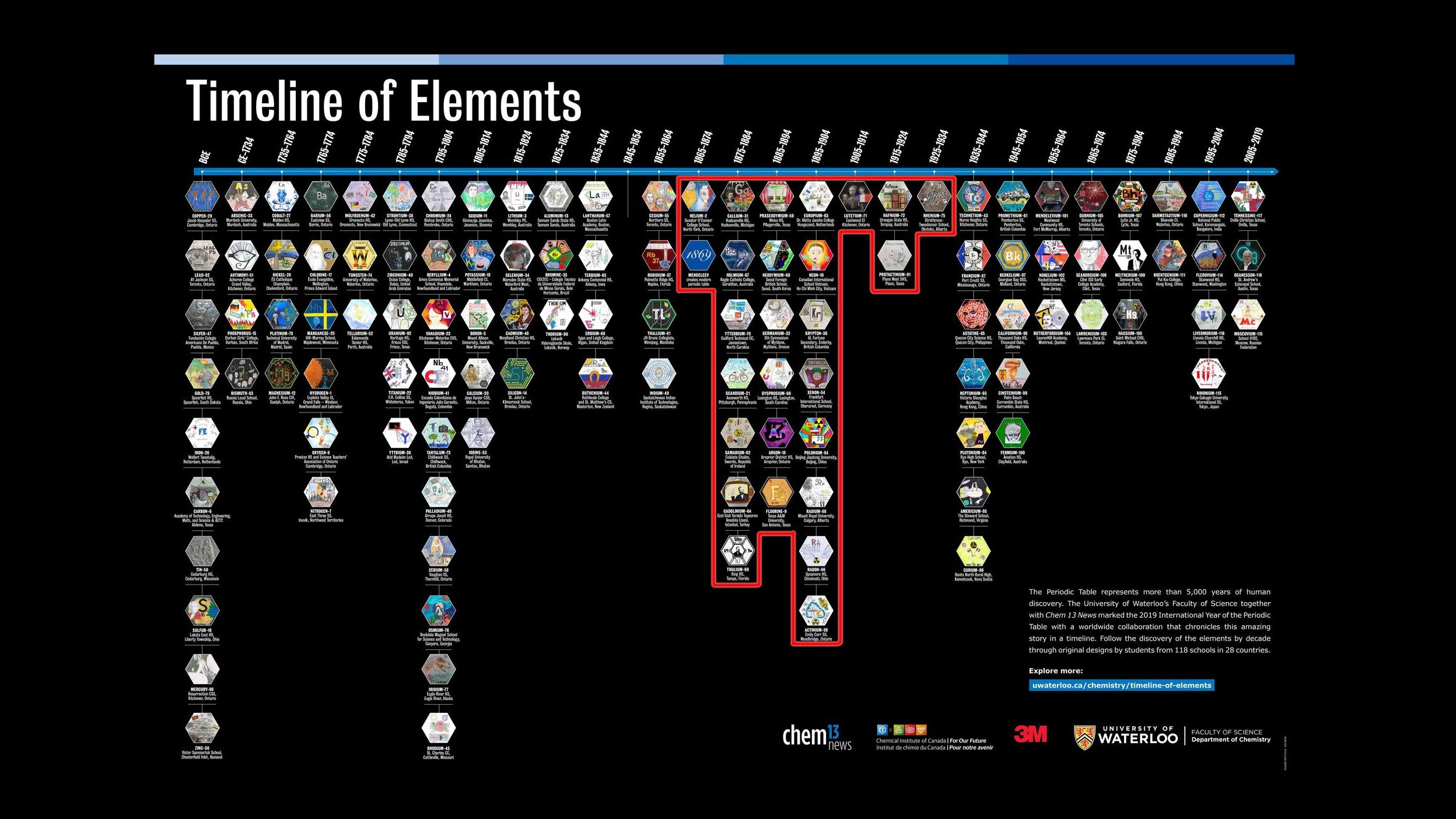 This series is a companion to our International Year of the Periodic Table project — Timeline of Elements and Mendeleev Mosaic. Time periods from our timeline project will be featured highlighting the historical and scientific advancements resulting in the discoveries of the elements of that period. James Marshall researches the history of the discovery of the elements. His studies have carried him to over 20 countries where he has photographed and documented specific sites which he describes in his publications on chemical history. Explore the artwork for the Timeline of Elements for The Periodic Table (1865-1934) with individual discovery stories of each element with acknowledgement to artist(s), teacher, school and countries on our Timeline of Elements website.