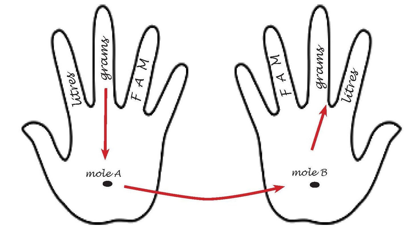 Once they are comfortable, students write moles of A on one palm and moles of B on the other (Fig. 3). Their fingers are still labelled with FAM, mass and litres. To go from one type of substance to another, they put their palms together to remember they must go through moles in the balanced chemical equation to convert. The trick is, the labels provide the map to the conversion — see Fig. 4. To convert from mass of A (finger on left) to, let’s say, molecules of B (finger on right), students must go through moles (their palms). If you watch the video, it will make sense, and I explain how I introduce this method to students.