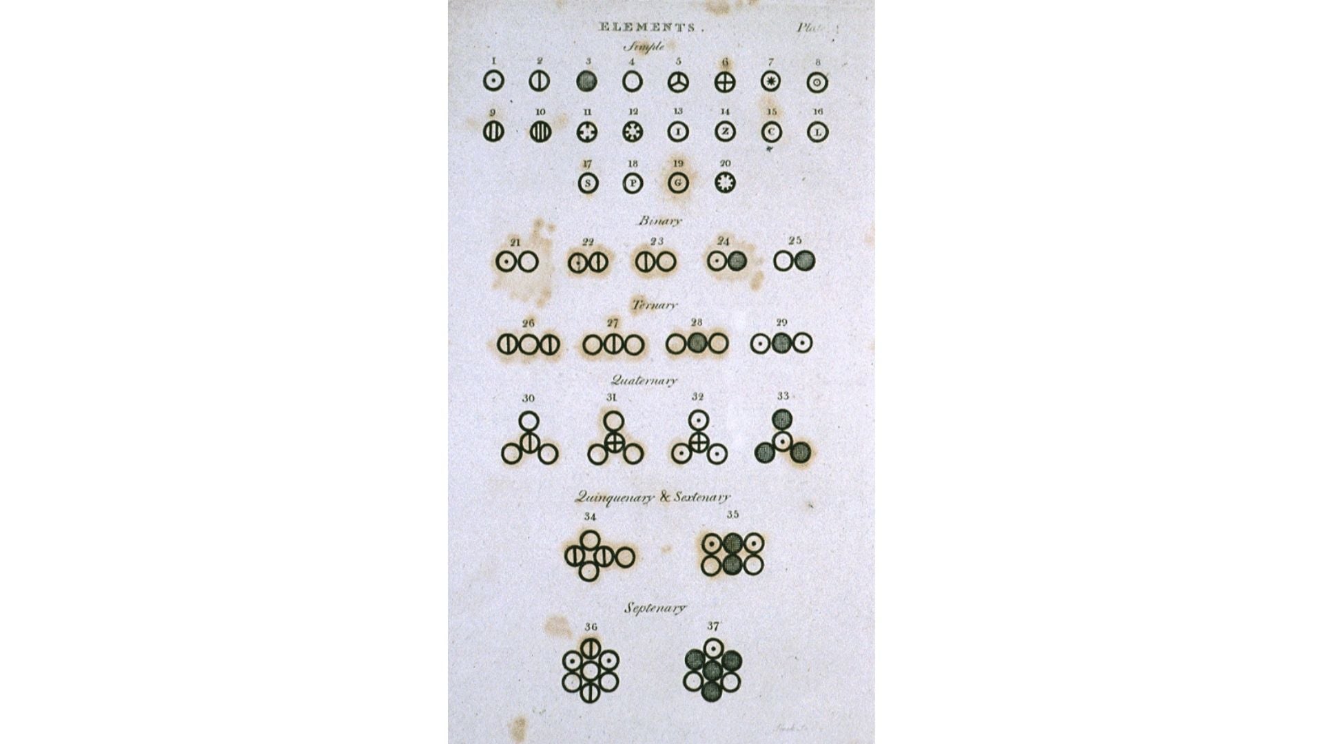 Fig. 1. Plates from Dalton’s book2 showing: symbolic representation of elements and compounds