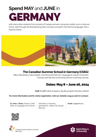 The CSSG is administered by Saint Mary's University and offers courses at almost-beginner, intermediate, advanced, and upper-advanced levels. Over 7 weeks, students receive 85 hours of classroom instruction and participate in numerous cultural activities: presentations at museums, visits to theatres and operas, sporting events, excursions to cities with cultural and historical significance, and a four-day trip to Berlin.