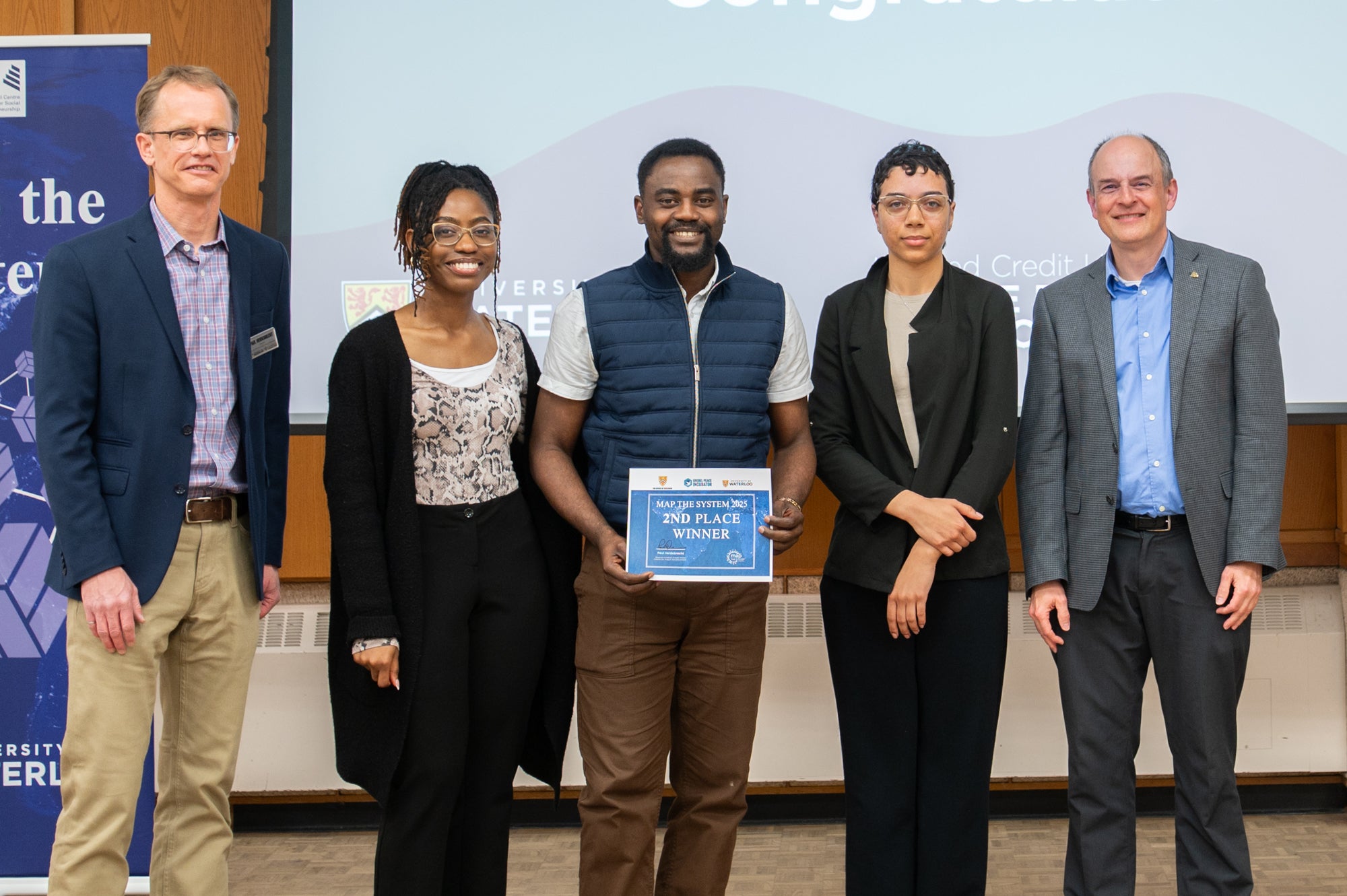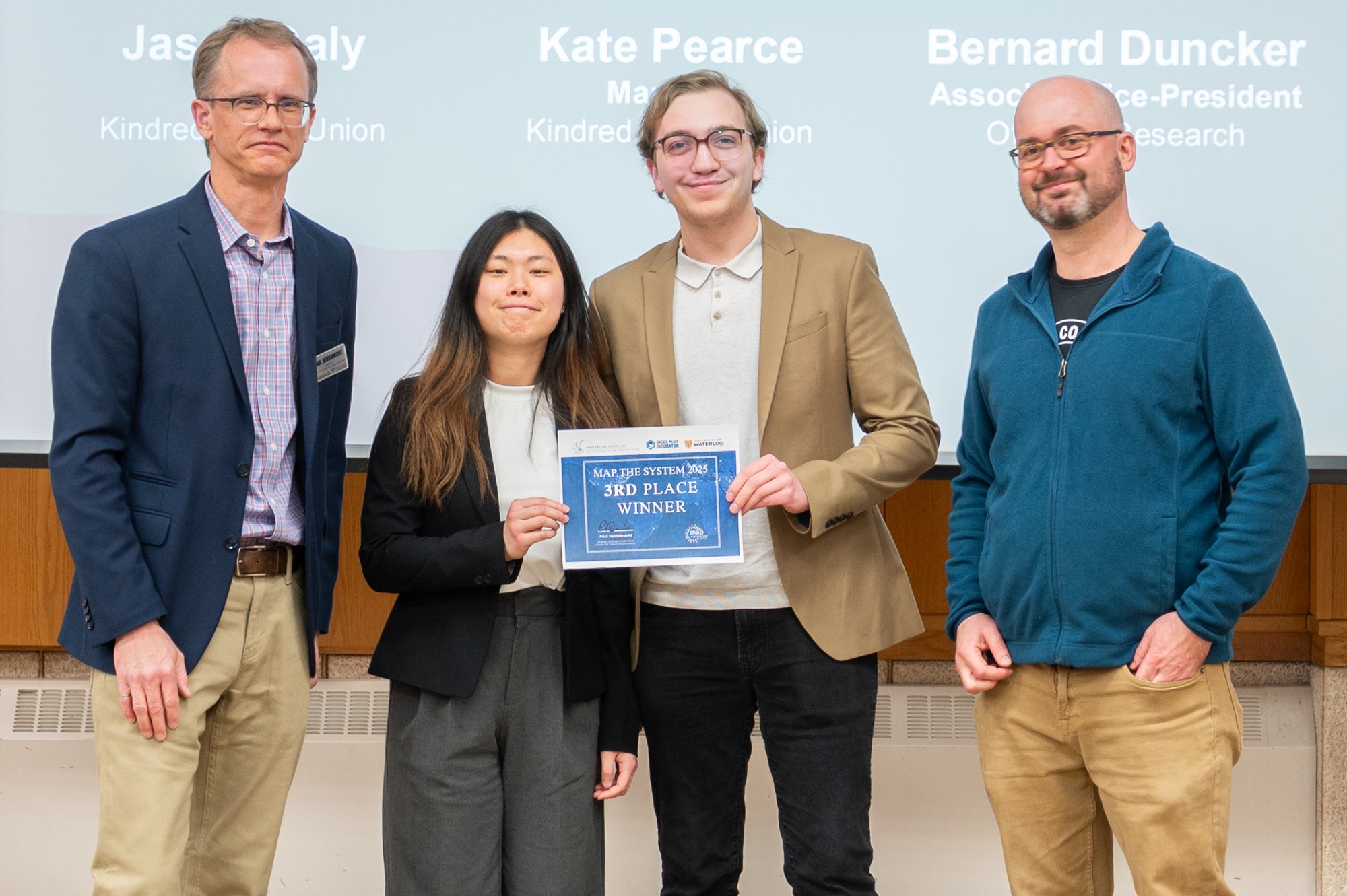 Coming in 2nd place were Femi Adedayo, Mya Nantambu, and Vanessa Young-Dede. This team explored a topic introduced by Peace for All Canada, a community partner in this year’s competition. Mya, an undergraduate Planning student, joined forces with Master of Business, Entrepreneurship, and Technology students, Femi and Vanessa, after realizing their interests were aligned. Their research into barriers to academic success for newcomer elementary school students was partly inspired by Femi’s firsthand experience of the challenges his son and his son’s friend face due to language and cultural barriers. The team won a $1,000 prize sponsored by the University of Waterloo’s Office of Research, which was presented by Bernard Duncker, Associate Vice President, Research and International.