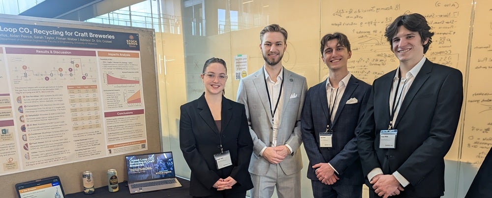 Another Sustainable Development Award went to Group 13. They designed a carbon capture system to improve the environmental performance of hydrogen production at a major Canadian oil operation, Suncor Energy’s Fort McMurray site. Their design used an amine solvent to capture CO₂ from the plant’s primary emissions source, improving both greenhouse gas impact and economic viability. Group members were Peyton Moffatt, Armanda Lima, Mikhaella Dias, and Junaid Fazal.