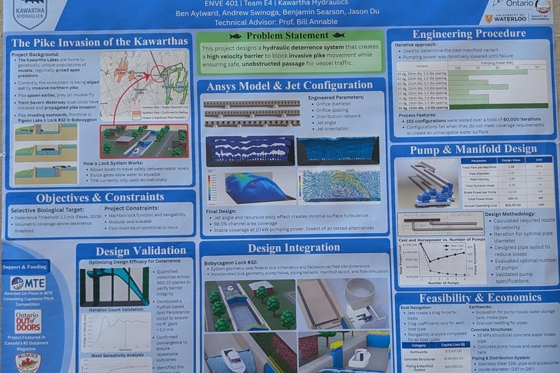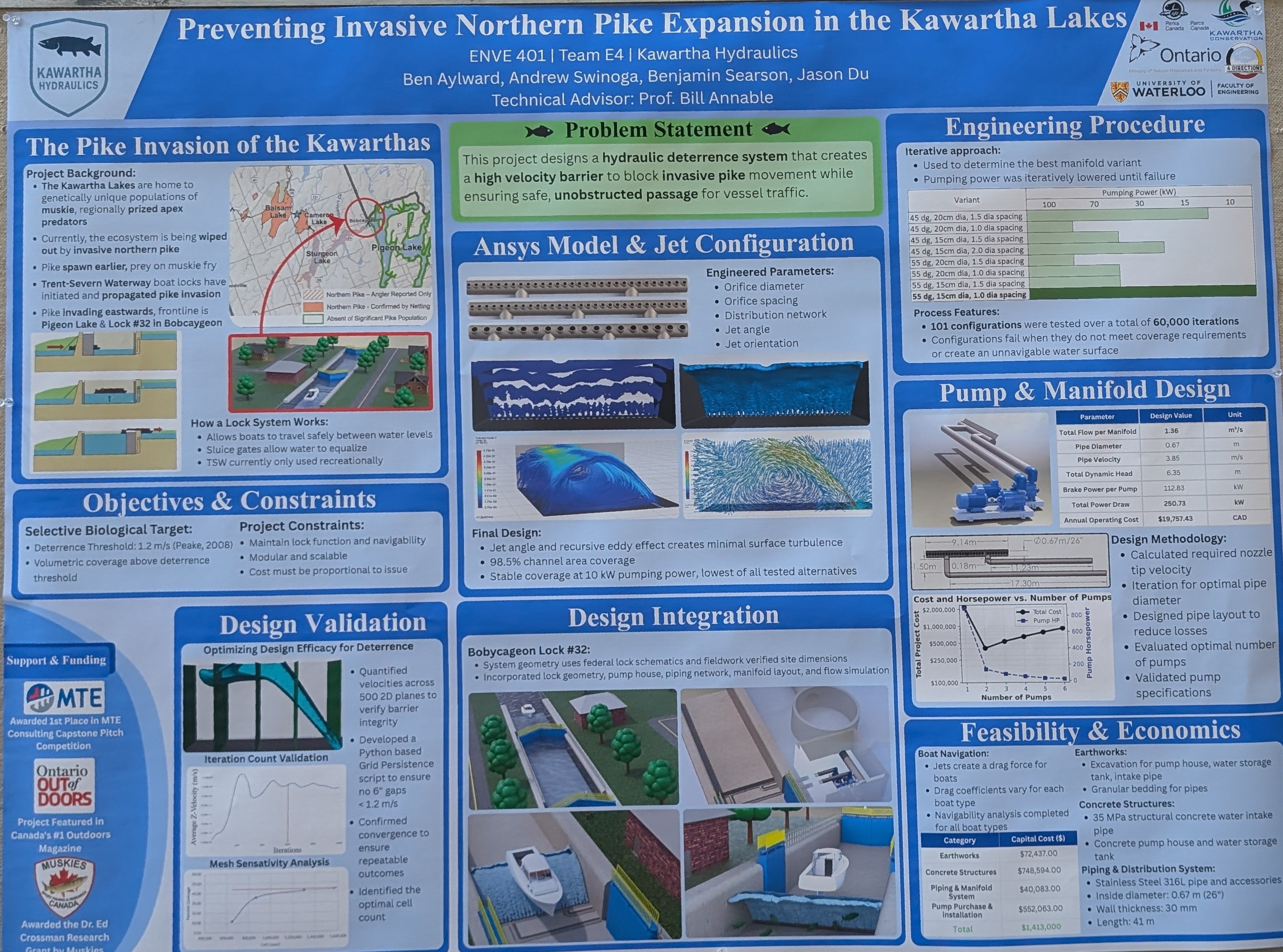 Led by project manager Andrew Swinoga, the team (Ben Aylward, Benjamin Searson and Jason Du) developed a proposed engineering solution aimed at limiting pike movement through the Trent–Severn Waterway’s lock systems while preserving boat navigation and ecosystem balance. The project, inspired by both academic research and personal experience, was supported by a research grant from Muskies Canada and developed in collaboration with Parks Canada, Kawartha Conservation, local Indigenous communities, and fisheries experts.