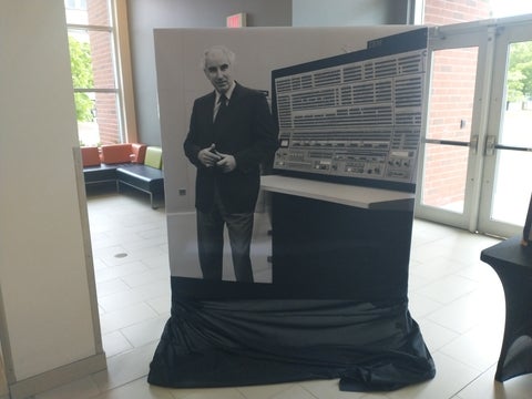 The display also featured a photo opportunity where visitors could pose with an image of Wes Graham standing next to the IBM 360/75 Operations Console.