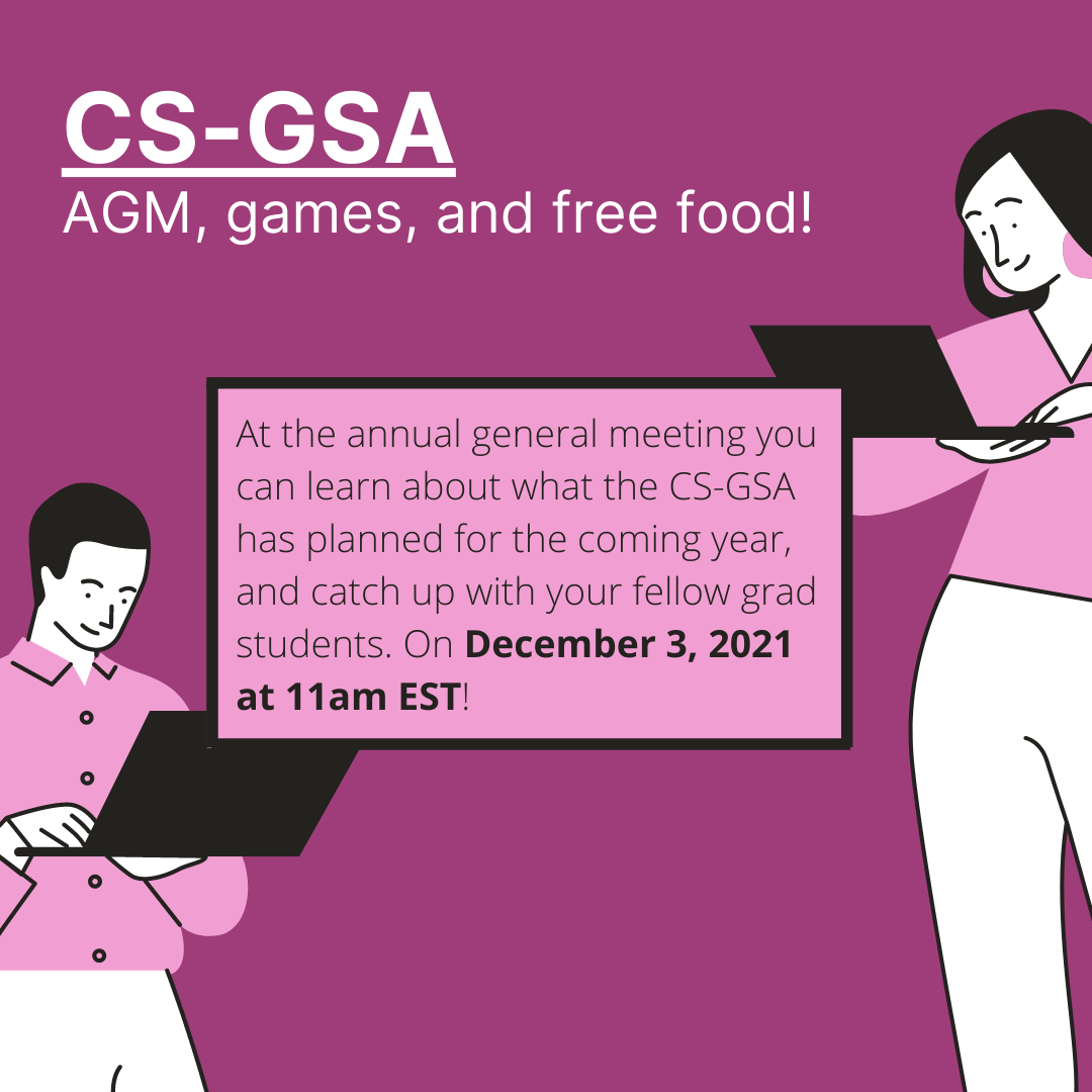 This is a great opportunity to learn more about what the CS GSA has been doing for the past year and our plans for the next year. We will also introduce our new Vice President and tell you more about how you can get involved!