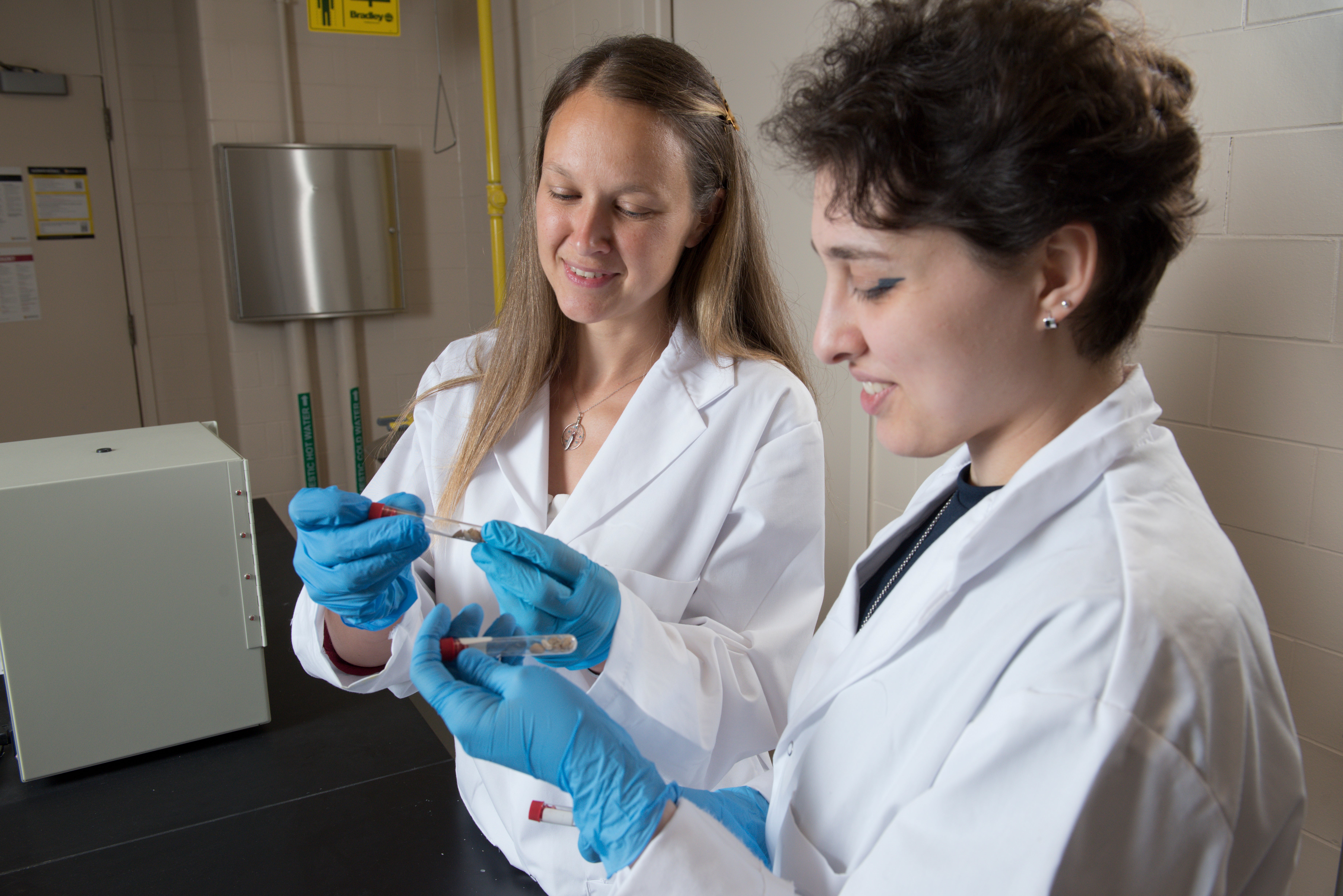 Professor and student observing vials of micro robots