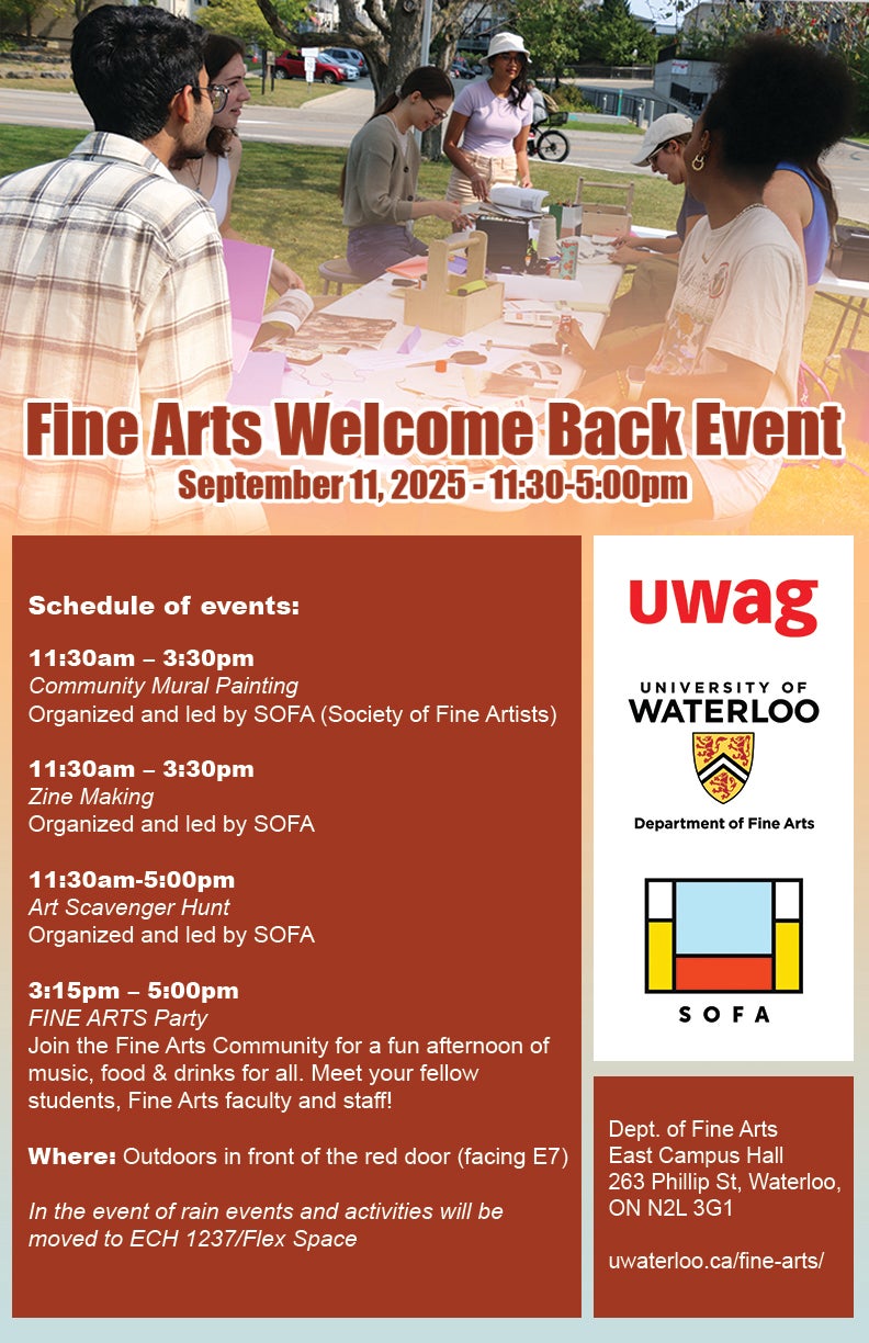 We will have art activities, food and drink followed by an opening reception for the exhibitions in the University of Waterloo Art Gallery (UWAG), all on Thursday, September 11, starting at 11:30am.