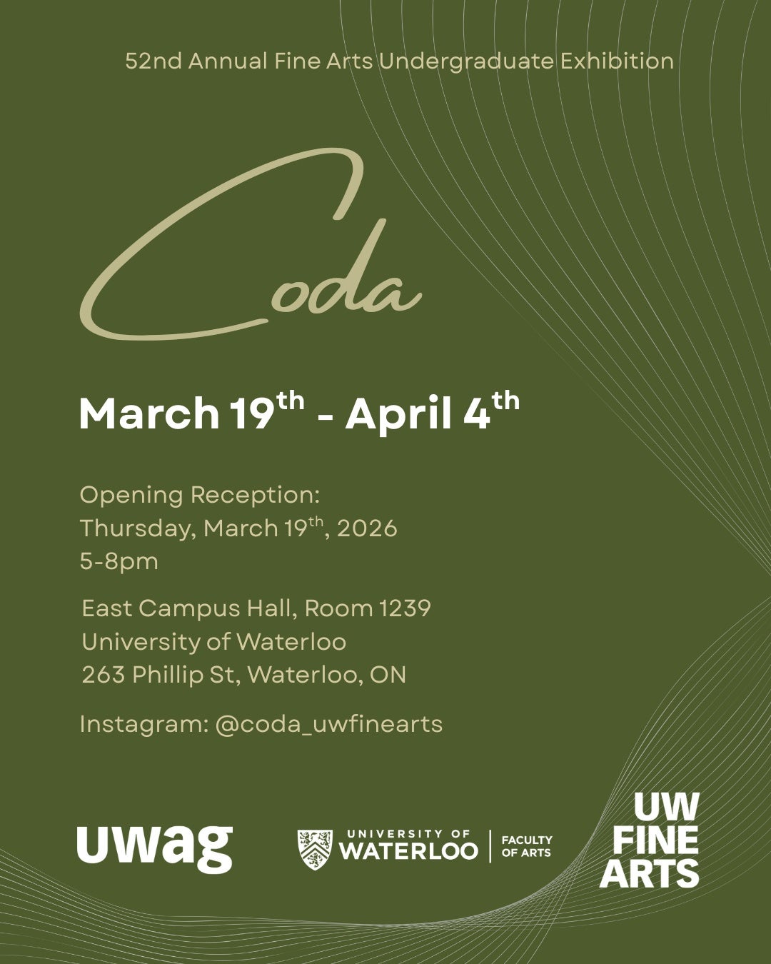 The Department of Fine Arts proudly invites you to Coda, the 52nd annual exhibition of artwork by fourth year honours studio students completing the Fine Arts undergraduate degree program at the University of Waterloo.