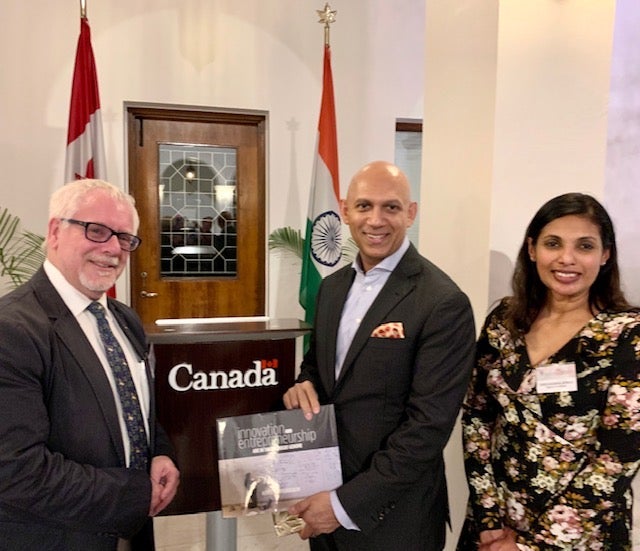 Douglas Peers, Professor of History and Ishari Waduwara-Jayabahu, International Relations Manager met with Canada's High Commissioner to India, Nadir Patel, while participating in a networking dinner in Delhi. The reception was organized by the Office of the High Commissioner, for delegations attending the Shastri Indo-Canadian Institute’s VC Summit. Peers and Waduwara-Jayabahu are representing the University of Waterloo, on an outbound mission to India, aimed at strengthening academic collaborations and partnerships in that region.