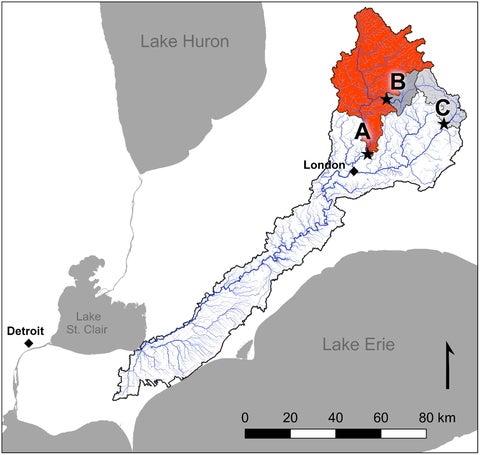 Fanshawe Reservoir is one of the three major dammed reservoirs on the Thames River in southern Ontario. Of these, Fanshawe Reservoir (indicated as "A" on the adjacent map) is the most downstream and has the largest watershed area, surface area, and water storage volume (1430.7 km2, 2.7 km2, and 13.1 × 106 m3). Note that the Thames River discharges to Lake St. Clair and subsequently to Lake Erie through the Detroit River. Fanshawe dam was constructed in 1953, primarily for flow regulation and to avoid flooding in the city of London, Ontario, which is located approximately 12 km downstream of the dam. Operated and maintained by the Upper Thames River Conservation Authority (UTRCA), Fanshawe Reservoir also generated hydroelectricity (2860 megawatt year−1) and recreational opportunities. An example of the research opportunities offered by the reservoir can be found at DOI: 10.1016/j.jglr.2021.11.008.