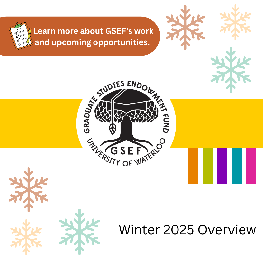 GSEF will be recruiting for new student representatives and officers in the upcoming Winter 2025 term! If you are interested in serving the graduate student community at UWaterloo through reviewing student project applications or supporting the overall direction of GSEF, check out upcoming openings in the Get Involved page of the GSEF website.