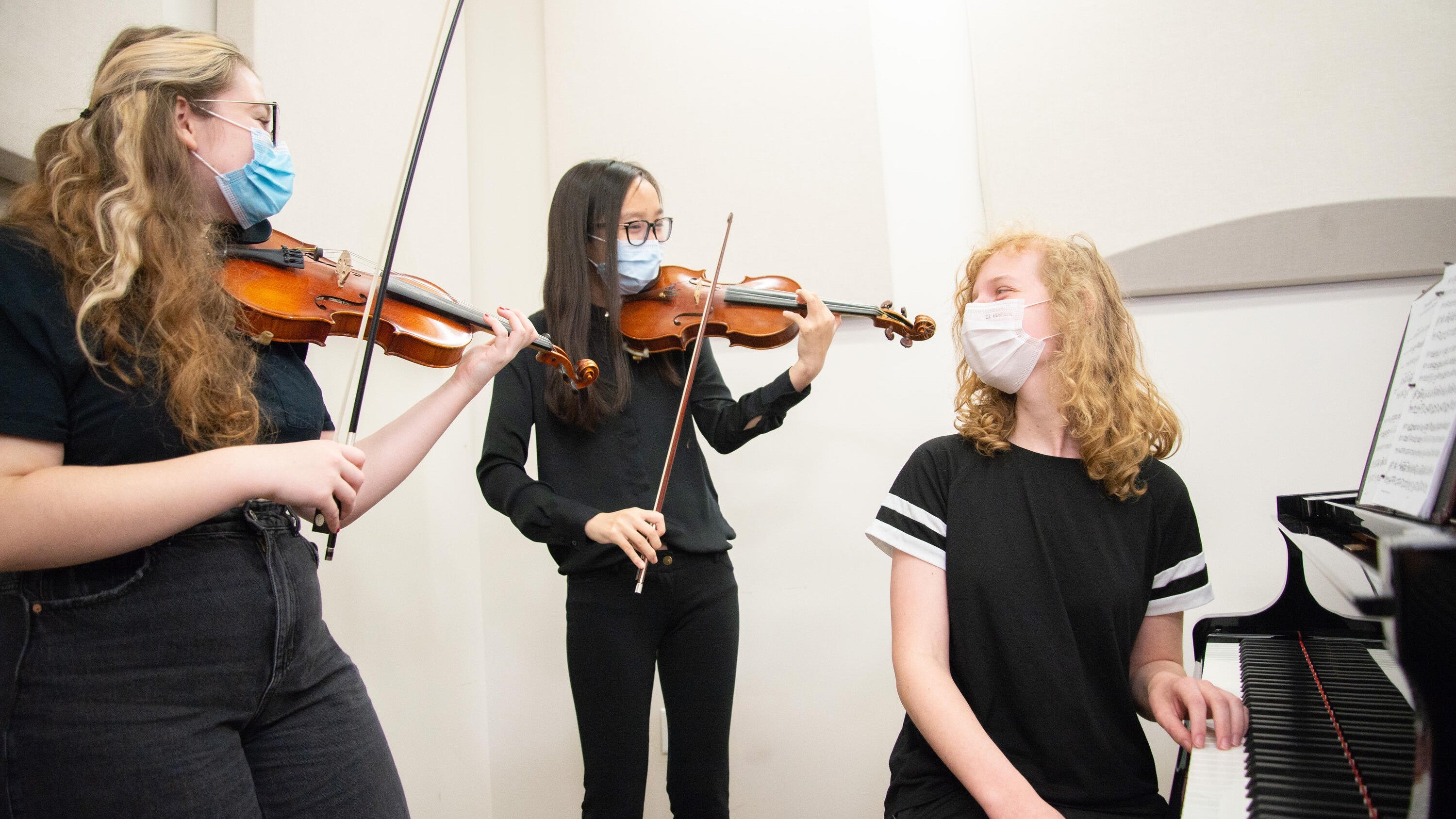 It is a delight for Grebel Music students to once again be making music in person! While some health precautions are still in place, live music is once again filling the chapel, classrooms, halls, and outdoor spaces. (Below) The Chapel Choir sang a piece at the Memorial Garden dedication. (Above) Instrumental Chamber Ensembles find it much easier to play together when they’re all in the same room!