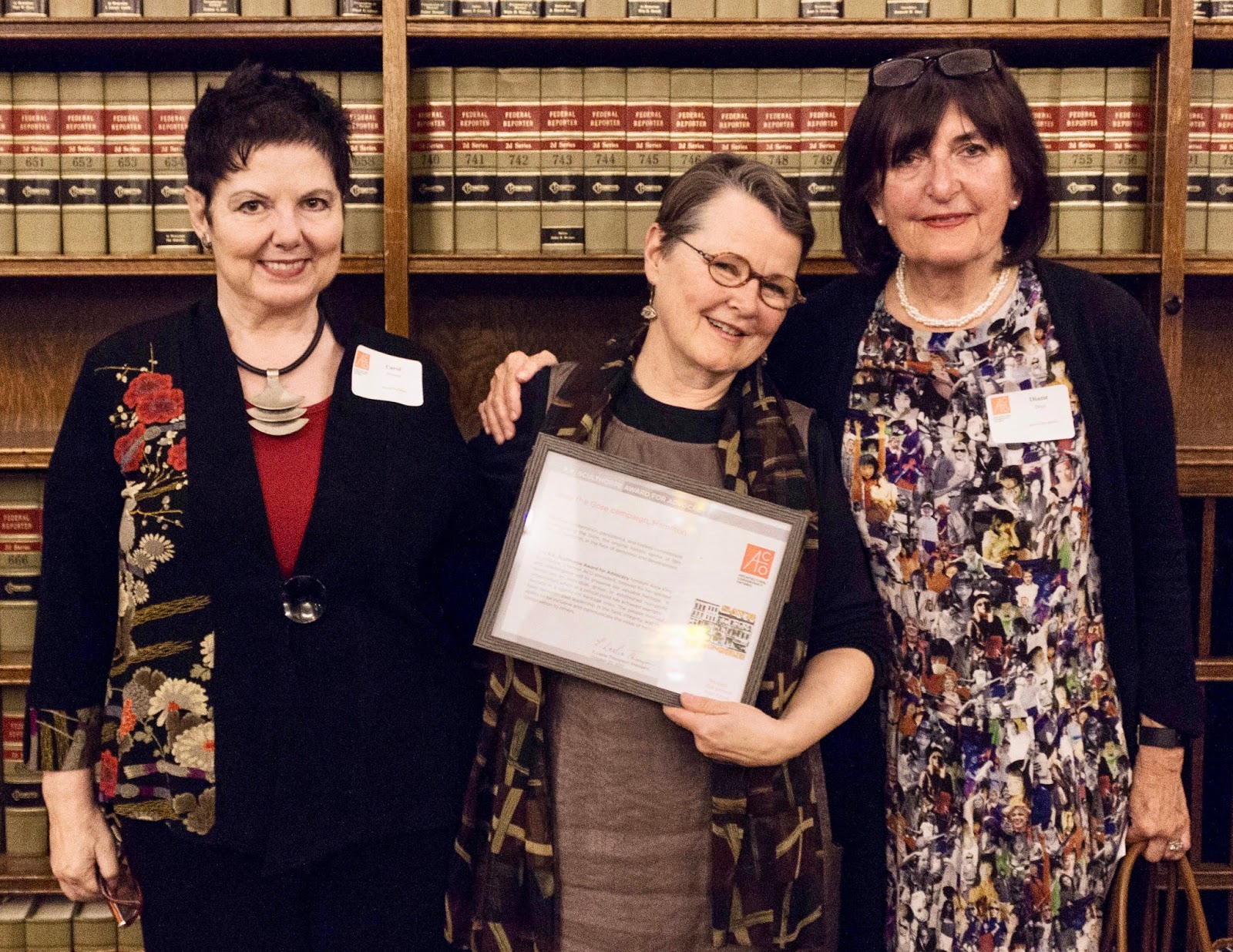 Friends of the Gore Carol Priamo (left) and Diane Dent (right) receiving an advocacy award from Cathy Nasmith at the October 2017 ACO awards dinner. Photo: Stephanie Mah