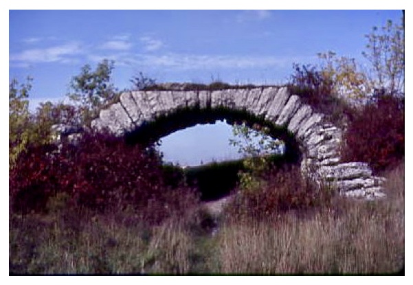 One of the distinctive effects of many ruins is a gradual softening over time of the hard angularity of the structure. The Sebringville bridge, half-swallowed in the encroaching verdure, reminds me of a line from Al Purdy’s poem “The Country North of Belleville”, about the vestiges of old farms: