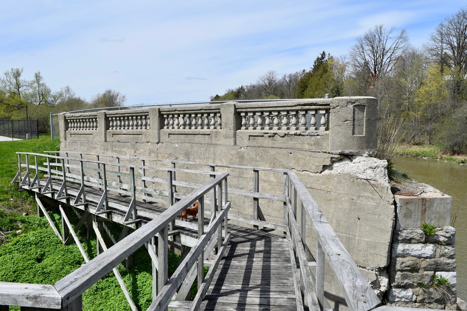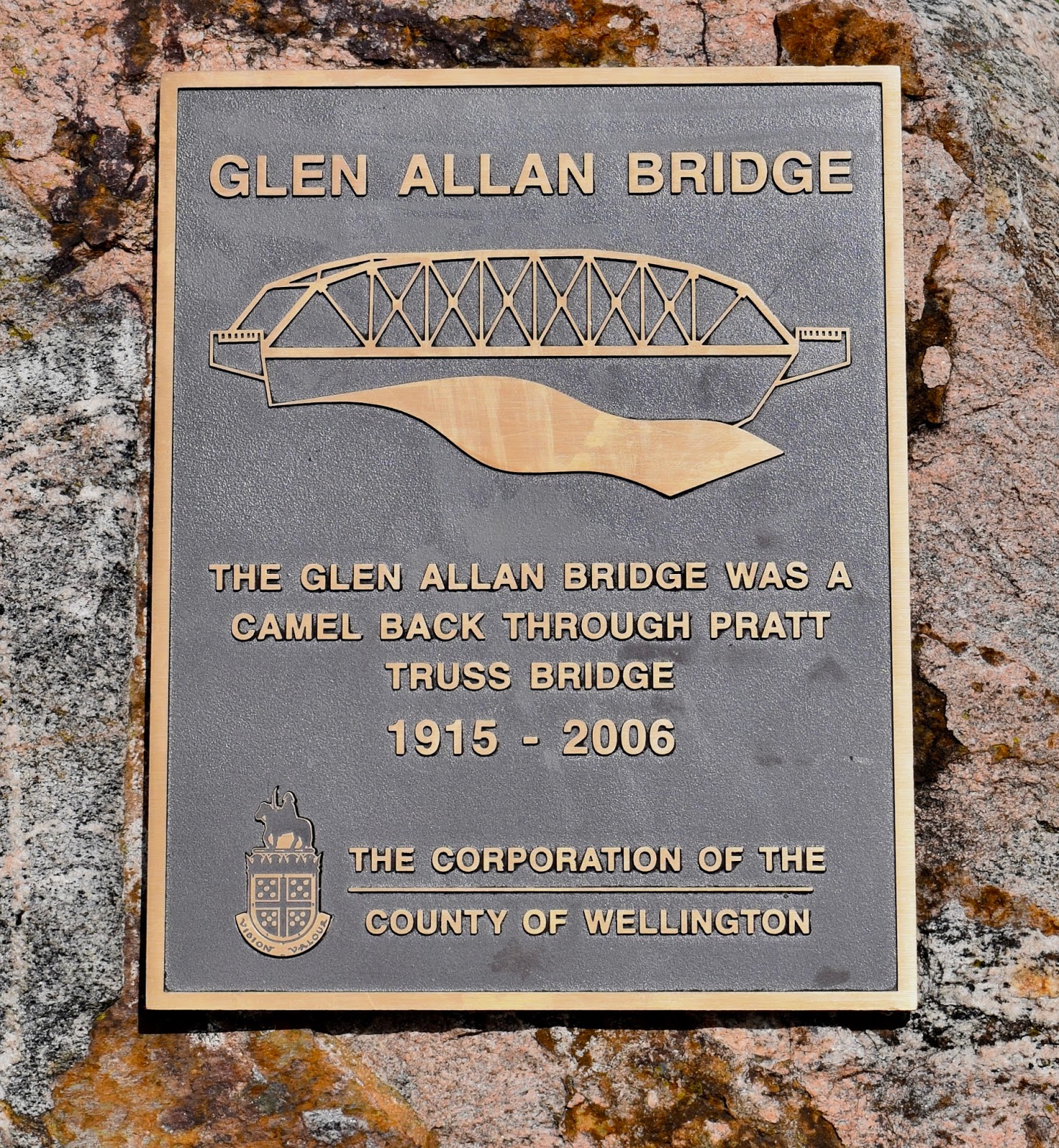 In Glen Allan, west of Elmira, the old bridge across the Conestogo River was removed, but the stone abutments and cement parapet walls of one of the bridge's approaches survive.