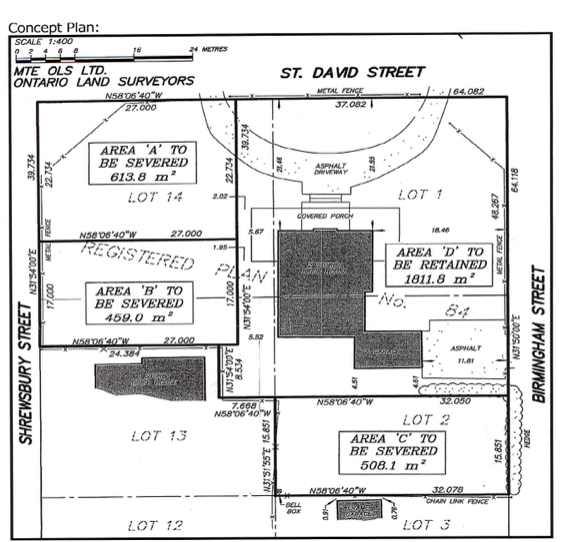 To recap from last time: the Stratford White House is an 1860s Italianate mansion dressed up with a much later oversized portico (with 18 columns!) and boasts a landscaped front and semi-circular drive. Prominently located on St. David Street, one of the “best” streets in town, the house currently has three residential units and an events facility. The property is the subject of an intensification/infilling proposal that would keep the house but cram in three new building lots on the back and west side (Areas 'A', 'B' and 'C' on the plan below).