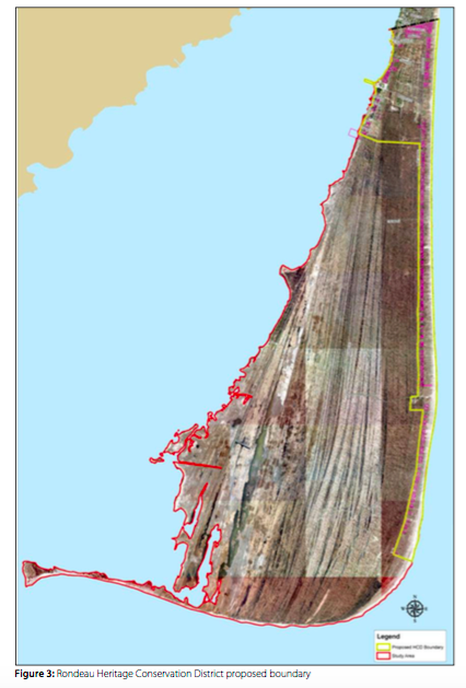 Note 1: In explaining the boundary of the proposed Rondeau heritage conservation district the HCD study states: "The concentration of resources within the proposed Heritage Conservation District includes both natural and built resources, in the form of the Park`s natural setting, beach areas, trails, roads, cottages, Park buildings, and supportive buildings. These features are all linked together at Rondeau Provincial Park and form a concentration of resources that are linked to the early cottaging industry in Ontario." (p. 48)
