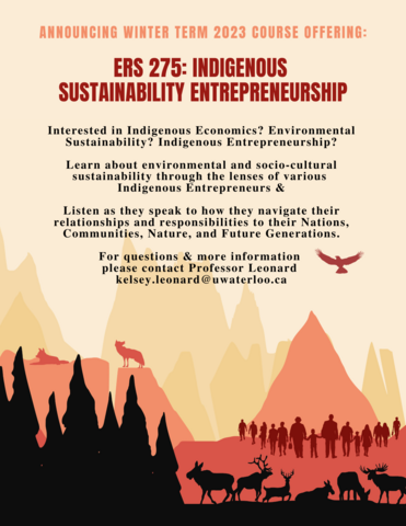 - Sign up to join ERS 275 Indigenous Sustainability Entrepreneurship! This course consists of having an various Indigenous Entrepreneurs across different industries (beauty, fashion, agriculture, health & wellness, and more) come join our class each week to speaks to their entrepreneurial journeys, their connections to the environment, sustainability, and so much more! Readings and further learning materials focus on relevant topics from each week’s entrepreneur’s field/industry. Notably, our course will give students a unique opportunity to help our Indigenous Entrepreneur’s solve sustainability related issues/problems that they are currently facing. Offering students well rounded, deep learning that they can benefit from beyond the classroom! This course is has no prerequisites and is open to all students, of any faculty, of any year! Just reach out to Dr Leonard about course permission code to sign up to join today! For any questions or more information please contact Dr Leonard at kelsey.leonard@uwaterloo.ca.