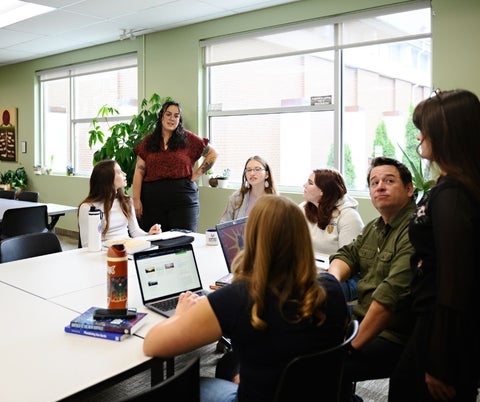2024, Shatitsirótha Waterloo Indigenous Student Centre, United College. Emma Rain Smith (left, standing) and Wanda Kidd (right, standing) and Indigenous students.