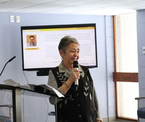 2024, University of Waterloo. Jean Becker speaking at a campus wellness event to welcome new Indigenous staff.