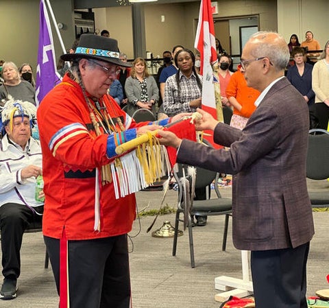 On March 27, the University of Waterloo community came together to welcome an Eagle Staff to our institution. The day began with a Sunrise Ceremony followed by a formal introduction ceremony held at Federation Hall. The ceremony began with drumming from the Cedar Hill Singers and a procession, followed by a prayer of thanks led by Elder Bill Woodworth. Indigenous Knowledge Keeper, Elder Myeengun Henry, introduced the sacred Eagle Staff on behalf of the University’s Indigenous community, marking an important step in Waterloo’s journey towards reconciliation.