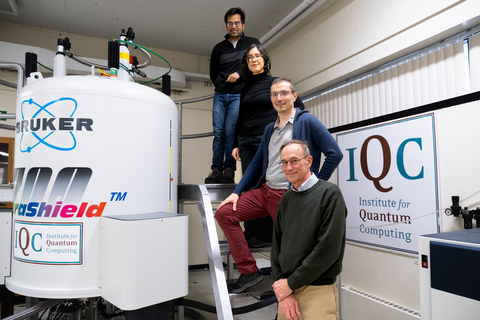 Raymond Laflamme, Eduardo Martín-Martínez, Nayeli Rodríguez-Briones et Hemant Katiyar posent devant un spectromètre de RMN.