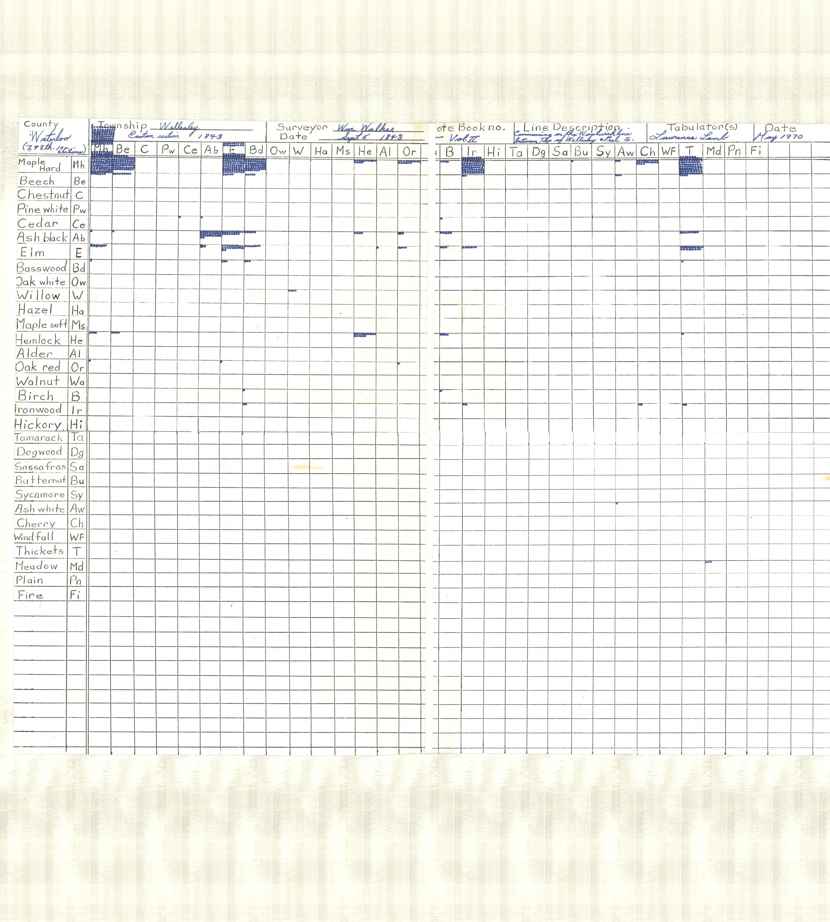 As listed on this master_inventory list (PDF) the Geospatial Centre's historical vegetation collection contains surveyor notes (JPG), pre-settlement vegetation maps (JPG), photo negatives of surveyor maps (JPG) and tabulation tables (JPG) .