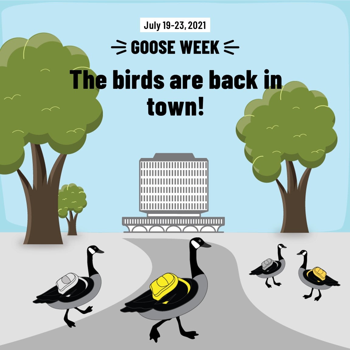 4 cartoon student geese wearing backpacks walking down a path to Dana Porter Library