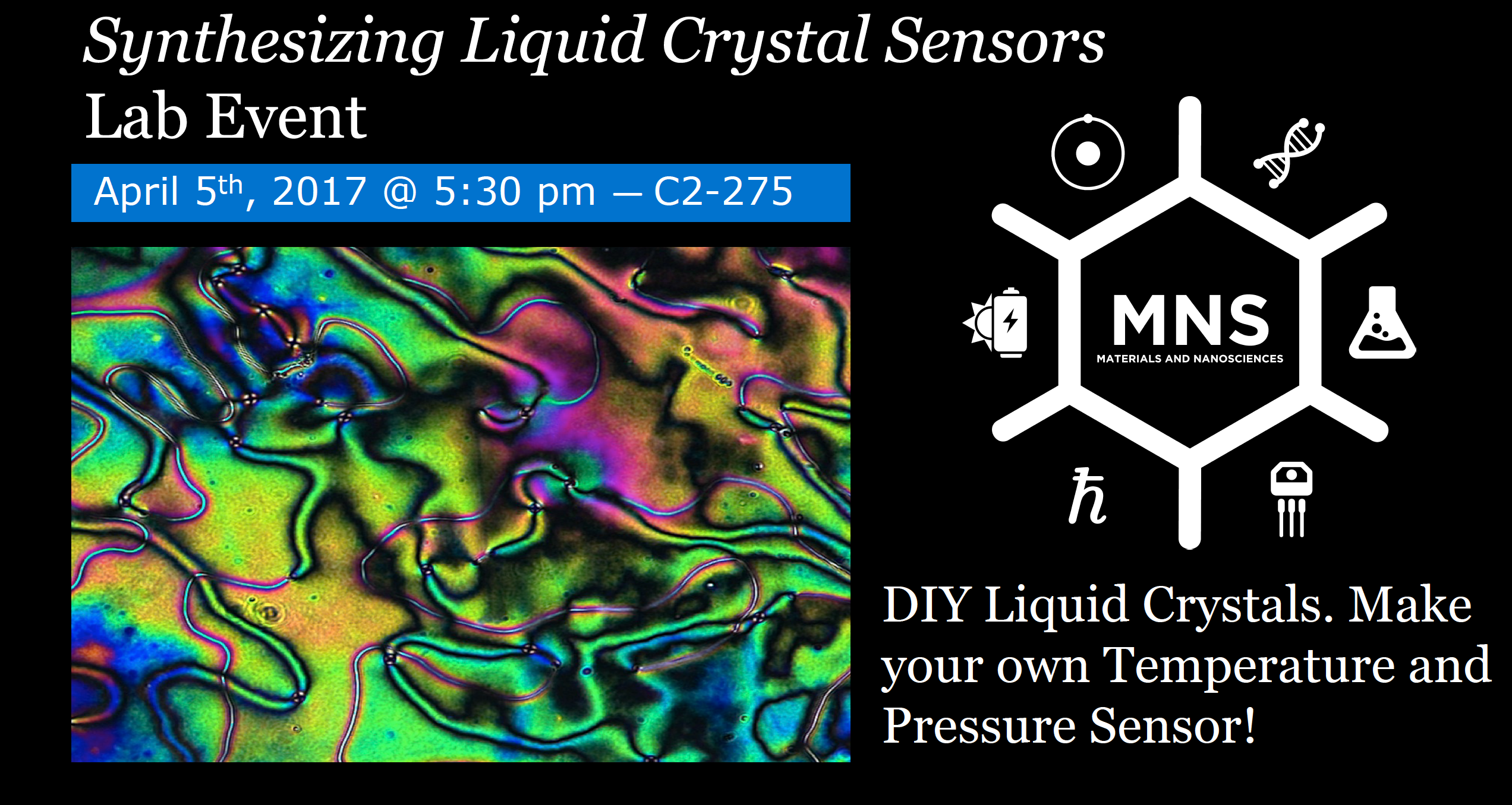Do it yourself (DIY) simple-cholesterol based liquid crystals that respond to temperature and pressure stimulus. Come make these colourful creations in the lab and see the interesting world of Cholesterol Liquid Crystals, it's exquisite colour, and it's wide array of applications. Finished products can be taken home! So make sure you come out to the lab to make your very own liquid crystal sample!