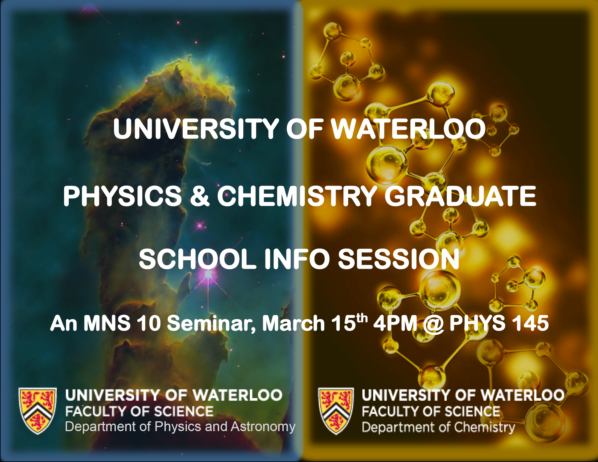 MNS 10 Seminar is hosting the Department of Physics & Department of Chemistry graduate school information session this Wednesday March 15th from 4-5pm.