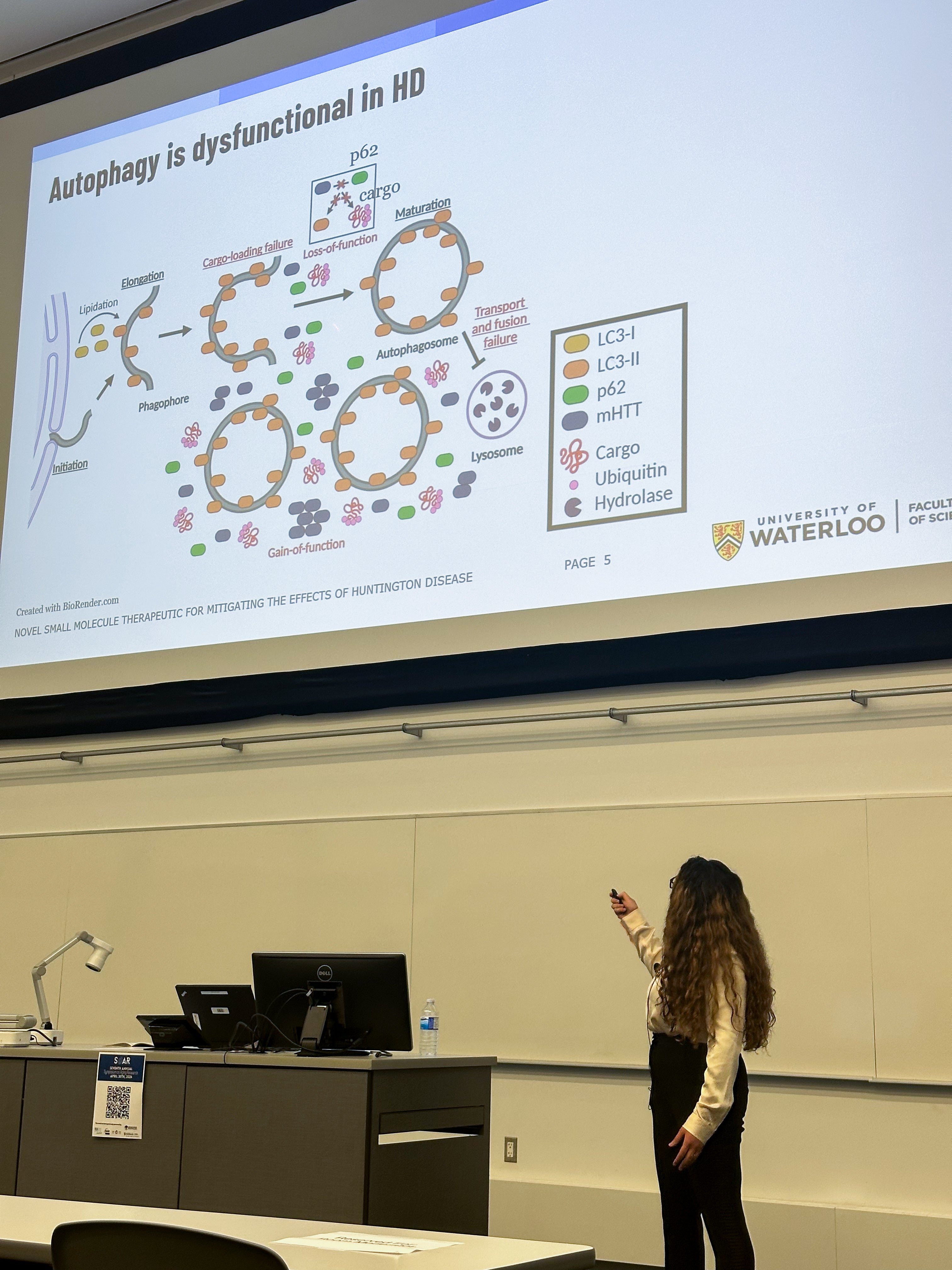 Her work focuses on enhancing a critical cellular process known as autophagy—the body’s natural system for removing damaged proteins and organelles to maintain cellular health. This process is especially important in the brain, where the buildup of toxic protein aggregates can lead to neurodegenerative diseases. In Huntington disease - a hereditary disorder that causes the progressive breakdown of nerve cells in the brain - this cleanup system is impaired, particularly during a step called cargo loading. Yasmeen’s research centers on a protein called p62, which helps guide cellular waste into the autophagic pathway. “We found that the palmitoylation of p62 is decreased in Huntington disease,” she explains. This protein modification is essential for p62 to function properly. By restoring it, we hope to rescue the autophagic process and help clear the harmful protein aggregates that accumulate in affected brain cells.”