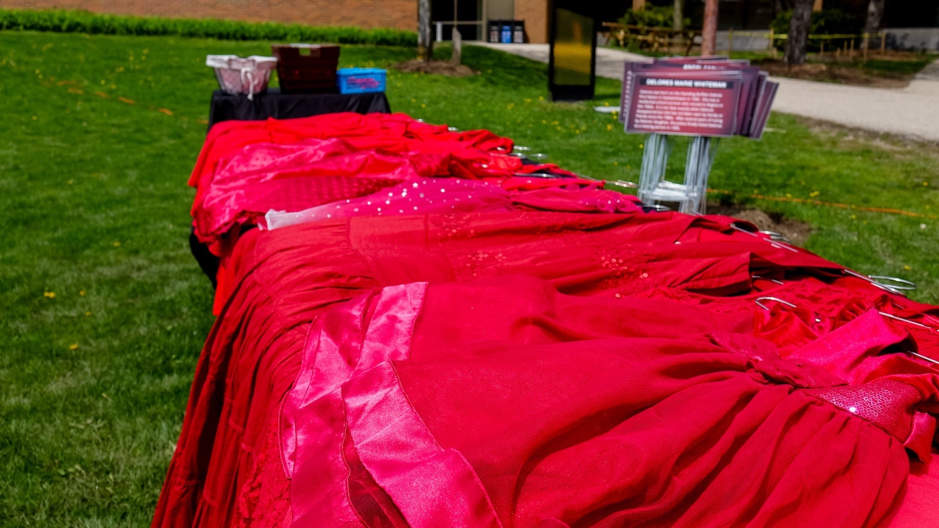 Red dresses hang from a tree in BC Mathews Hall Green in 2023.