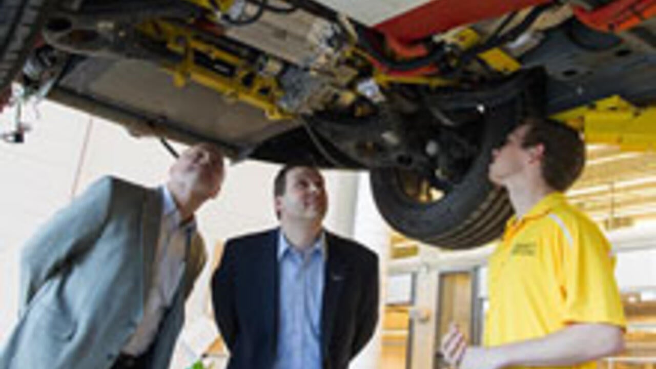 (left to right) General Motors corporate Vice President Ken Kelzer and Executive Director Brandon Vivian examine vehicle modifications made by University of Waterloo’s alternative fuels team (UWAFT) with team lead Patrick Ellsworth.