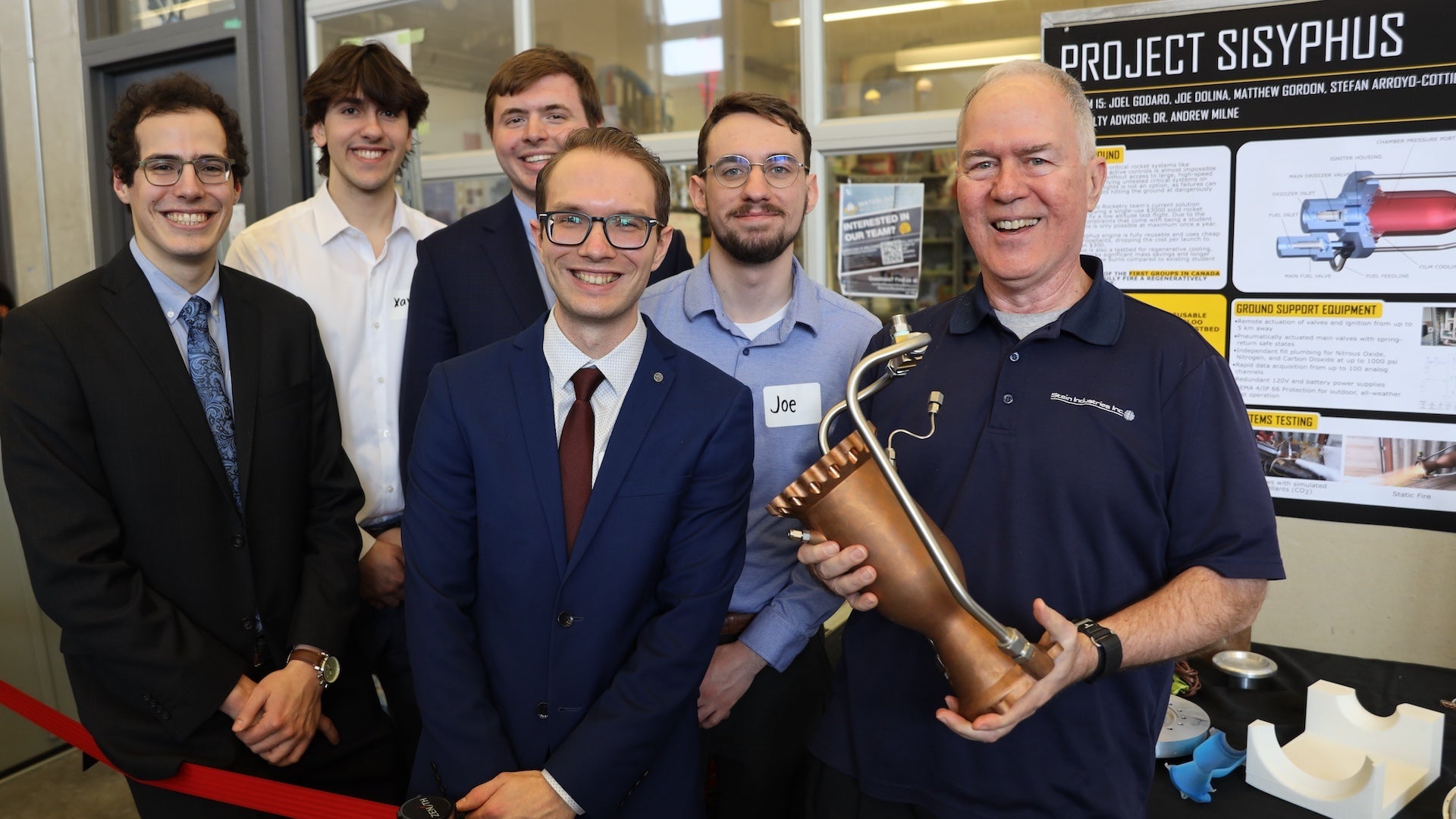 The Project Sisyphus team graduates in the spring. Godard and Gordon both joined Waterloo Rocketry as first-year students and did co-op work terms at Rocket Lab in New Zealand — Godard worked on a spacecraft now on its way to Mars with his name engraved on it.