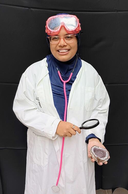 Tasbiha Saif Ansari wears a lab coat and safety equipment while examining a geod