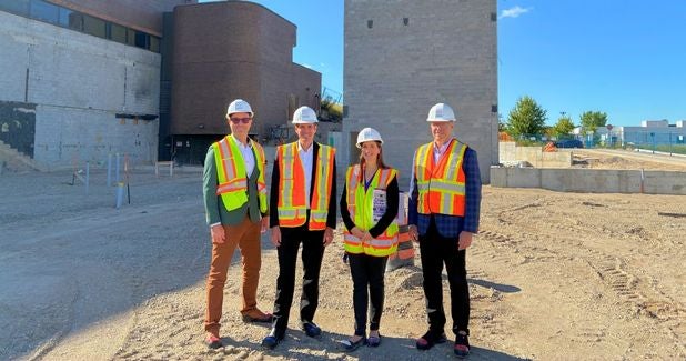 Simon Robert of EssilorLuxottica, Dr. Ben Thompson and Kelsey Gagnon of the School, and Bruce Miles of EssilorLuxottica on a visit to the Waterloo Eye Institute construction site